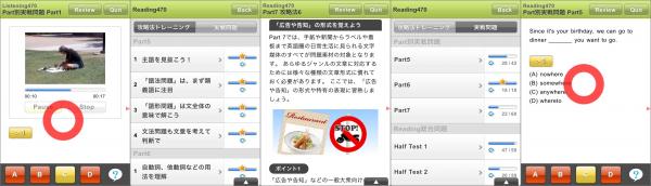 TOEICRテスト全PART(PART1~7)の問題形式をiPhone/iPod touch上に再現しました。「PART別実戦問題」は1問ごとに解答を確認できるので、通勤や休憩のちょっとしたスキマ時間に、場所を選ばず問題演習をすることが可能です。また、各コース別に「Half Test」を2回分収録。受験直前に模試形式のトレーニングで本試験対策ができます。