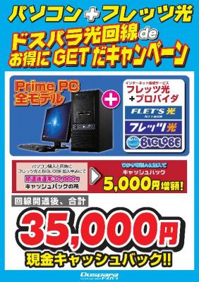 全国21店舗及びウェブ通販のパソコンショップ『ドスパラ』を運営する株式会社サードウェーブ(代表取締役 : 尾崎健介、本社 : 東京都千代田区)は、2012年5月26日(土)より、ドスパラ店舗において、パソコン購入と同時に「フレッツ光」と「BIGLOBE」を契約されると、キャッシュバック額を5千円増額して最大3万5千円をキャッシュバックする『ドスパラ光回線deお得にGETだキャンペーン』を実施いたします。