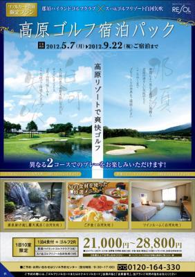 プラン概要は、1日目に栃木県・那須高原の「那須ハイランドゴルフクラブ」で1ラウンドプレー後、同じ東北自動車道沿いにある福島県・白河高原の「スパ&ゴルフリゾート白河矢吹」のコース内ホテルに宿泊。源泉掛け流しの温泉露天風呂や、旬の食材を使った特選メニューの夕食などをゆっくり楽しみ、2日目は同ゴルフ場にて1ラウンドプレーするというもの。料金は、1泊4食付で異なる2コースのプレー=21,000円~28,800円というリーズナブルな設定となっています。