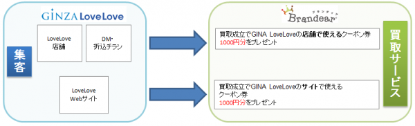 今回の提携により、「GINZA LoveLove」では「ブランディア」への買取促進を行うとともに、「ブランディア」で買取が成立した場合には、「GINZA LoveLove」で利用できるクーポンを発行することで、相互送客を促してまいります。