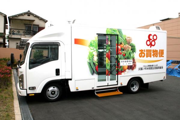 ■大型冷蔵庫を備えた2トン車で、食料品など生活必需品をお届けする移動販売車です。実際に商品を手にとってお買物ができます。