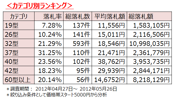 テレビ市場の売上が伸びると予測される夏のボーナスを前に、ゴールデンウィークから夏のボーナス前(2012年4月27日~5月26日)のネットオークション市場においてのサイズ別液晶テレビのカテゴリ別ランキングを発表いたしました。