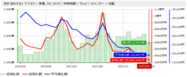 次に、ネットオークション市場における32型の2年間(2010年3月~2012年4月)の落札動向データを発表いたします。