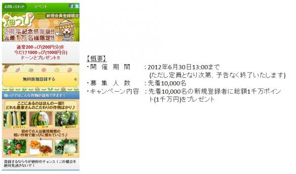 単にゲーム内の農園で作物を育てるだけでなく、丹精込めて育てた作物を収穫すると、実際に本物の作物が無料(送料無料)で自宅に届くので、育てる楽しさや収穫後の嬉しさ、達成感などを体験できる、いまだつてない画期的なケータイゲームです。