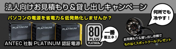 一般的なATX規格のパソコンを業務PCやサーバ用途でご利用の方は、是非本キャンペーンをご利用ください。お見積もりやお貸し出し希望を頂いたお客様には、パソコン内部の冷却部位を任意に調整可能なSPOT COOL(http://www.links.co.jp/item/antec-spot-cool/)を1つプレゼントいたします。消費電力、発熱や静音性の評価検証用に貸し出しも行っていますのでお気軽にお問い合わせください。