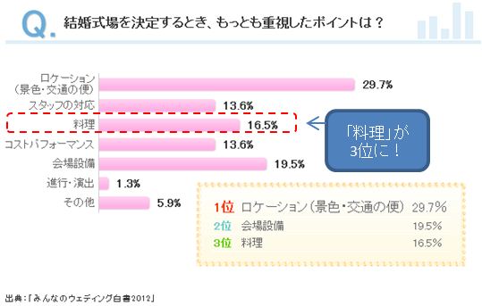 「結婚式場を決定するとき、もっとも重視したポイントは?」という設問では、1位「ロケーション(景色・交通の便) 29.7%」、2位「会場設備 19.5%」、3位「料理(16.5%) 」となりました。 「料理」は、昨年5位(13%)から3位にランクイン。料理に最も重きを置くカップルも、少しずつ増えているようです。