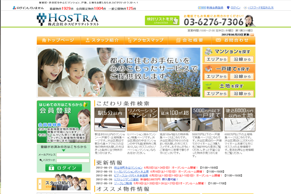 この度の『株式会社ホスピタリティトラスト』様のホームページは、"都心にするお手伝いを心のこもったサービスでご提供致します"をコンセプトに、新宿区・渋谷区エリアの売買物件を扱うホームページとなっております。
