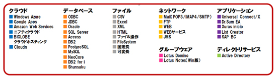 ファイル、各種データベース、Lotus Notes、LDAP(Active Directory)、Lotus Domino、Lotus Notes、BIツールといった多種多様なデータソースに対し、 アダプタを用いて容易にデータ連携を実現できます。