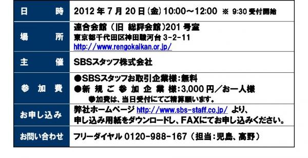 セミナーは「改正労働者派遣法の全容について」と「法改正後の対策とSBSスタッフの方針について」の2部構成。講師は、同社人材サービス事業コンサルタントの小松太郎です。同社お取引先様は無料ご招待、新規ご参加企業様はお一人様3千円の参加費を頂戴いたします。