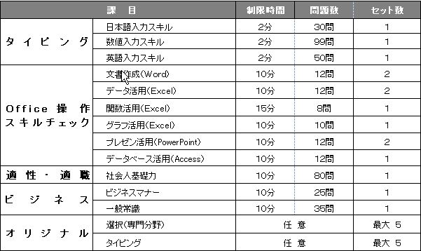 パソコンの基本的な入力スキルを、(1)「日本語入力スキル」と(2)「数値入力スキル」(3)「英語入力スキル」のテストで診断します。測定時間は各2分間。その間に入力された文字数(英文はワード数)と正確性でスキルレベルを診断します。また、問題文の変更はオプション機能にて可能です。