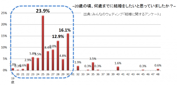 1) 「20歳の頃何歳までに結婚したかった?」→トップ「25歳まで(23.9%)」