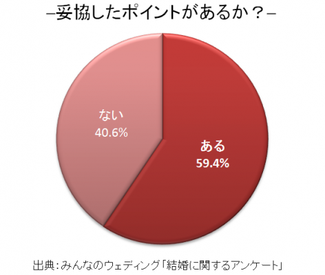 結婚への憧れを抱く一方、「結婚を決めた時、パートナーに対して妥協したポイントは、ありますか?」という設問に対し、「妥協したポイントがある」という回答が59.4%という結果となりました。妥協ポイント(複数回答)の傾向としては、「経済面(収入/貯金)(33.2%)」「外見(25.5%)」「性格(20.1%)」という結果が出ています。