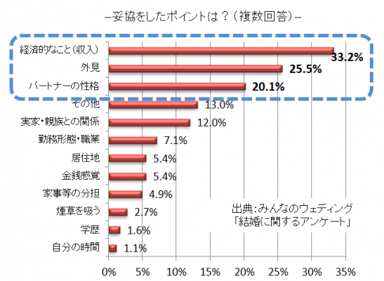 2) 「結婚を決めた時妥協したポイントは?」→トップ「経済面(33.2%)」