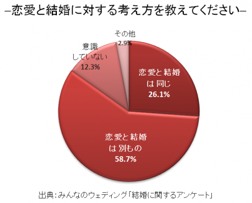 「あなたの恋愛と結婚に対する考え方を、教えてください。」という設問に対し、トップ回答は「恋愛と結婚は別もの(58.7%)」。以下2位「恋愛と結婚は同じ(26.1%)」、3位「意識していない(12.3%)」、4位「その他(2.9%)」という結果となり、別モノ派が同じ派の倍以上存在することがわかりました。