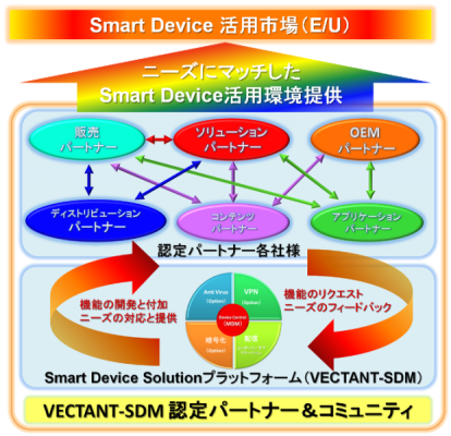 この度、発表する「VECTANT SDMパートナープログラム」は、企業がスマートデバイスを導入・活用する際に必要となる様々な技術やサービスを有したパートナー企業が集まり、VECTANT SDMをスマートデバイス導入・活用のプラットフォームとしたコンソーシアムを形成することにより、スマートデバイスの導入から活用までの幅広い過程においてユーザ企業を支援し、更にはスマートデバイス活用市場を活性化することを目的としたものです。また、本パートナープログラム加盟企業を得意分野によりカテゴリー分けして公表することにより、これからスマートデバイスの導入・活用を検討されているユーザ企業様が自社の課題を補う為の技術やサービスを有しているパートナーを識別でき、適切な問合せ先/購入先を選択することが可能となります。