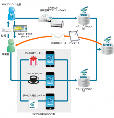 係員がサービスのご案内をする際も、ご来場者のQRコードを読み取り、説明したサービスの種類、関心をお持ちの機能などを追加入力し、ブース内での行動データを収集し、「スパイラル(R)」に登録いたしました。ご来場者にはゲーム感覚でお楽しみいただき、パイプドビッツは、手間をかけずにブース内の行動履歴データベースを完成させました。