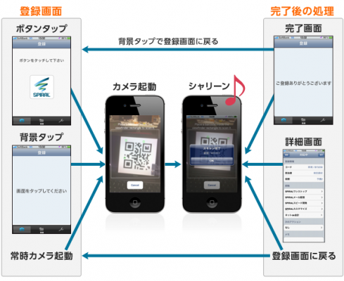 「スパイラル(R)シャリーン」は、QRコードを読み取り、読取情報に選択肢やフリーテキスト等の追加入力情報を付加して「スパイラル(R)」のデータベースに登録できるiPhoneアプリです。
