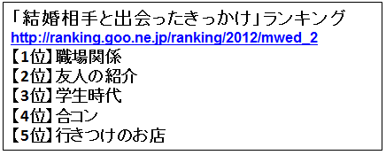 また、 「gooランキング 『みんなのウェディングランキング』」の1回目として「結婚相手と出会ったきっかけランキング 」と、そのランキングに関するコラムを本日より公開いたします。