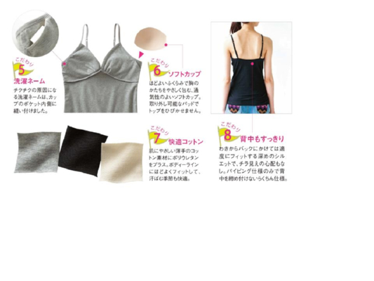 ヤマシタトモコさんの「楽チン」を重視しながら「インナーでありながらも外に着ていける」「ボディメイクするのではなく体のラインを自然に見せたい」という細やかな要望が形になった、徹底してディテールにこだわった商品です。すでに市場に出回っているブラキャミとはまた違う使用感の仕上がりとなっています。デザインや色はきわめてベーシックで、多くの女性が感じている細かなニーズにフィットする商品としてご好評をいただいています。