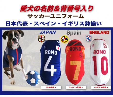 日本、イギリス、スペイン代表の犬用サッカーユニフォームは、愛犬の名前とお好きな背番号を入れられる犬用ランニングになります。