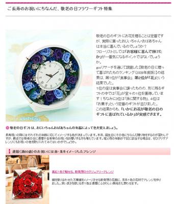 【概要】アミファではプリザーブドフラワー花材のショッピングサイトであると共に、花文化のより一層の発展のため、シーンに合わせた、情報ページを掲載しております。本コンテンツは2012年9月17日の敬老の日ギフト商戦を見据えたフラワーショップ・ギフトショップのサポートコンテンツです。もらって嬉しい花ギフトを、これまで以上により多くの方にご利用頂き、花文化のより一層の発展を期待しております。 【詳細】◆敬老の日に贈って喜ばれるギフトとは?おじいちゃん・おばあちゃんは家族での食事会が一番嬉しいとの結果に。品物として贈るならどんなものが喜ばれるでしょうか。◆近年、敬老の日に還暦や古希のお祝いを行うケースが増加。年齢に応じたふさわしい色とは?長寿祝いの際にはそれぞれの年齢に応じてイメージする色が決まっています。色で表現しやすい贈り物のフラワーギフト。実際のアレンジ写真と合わせてご紹介。