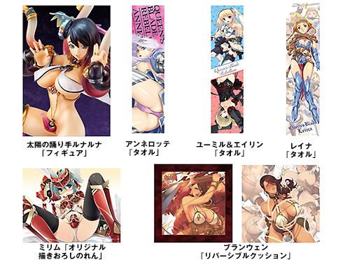 1回600円で、ハズレくじ無し! 「クイーンズブレイド リベリオン 太陽の踊り手ルナルナ」などの超レアフィギュアをはじめ、ミリムの“秘密の扉”を開く「オリジナル描き下ろしのれん」やブランウェンのムフフなイラスト満載の「リバーシブルクッション」、レイナやアンネロッテ、ユーミル&エイリンがオシャレにデザインされた「マイクロファイバータオル」など、今回のくじのためだけに作り起こしたグッズを多数ご用意いたしました。ぜひホビージャパンブースで運試し、レアアイテムをゲットしてください。