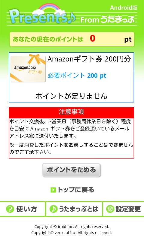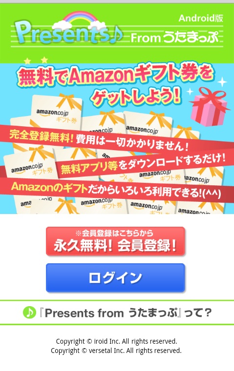 本Webは登録料、利用料は一切必要がございません。Webに掲載されているアプリ等をダウンロードするとポイントが貰えて、そのポイントを集めることによりiPhone版はiTunes内の好きな楽曲、Android版はAmazonギフト券に交換出来るサービスです。既に累計165万ダウンロードされているユーザーへもっと楽しくアプリを利用して欲しいとの思いから、生まれたサービスです。