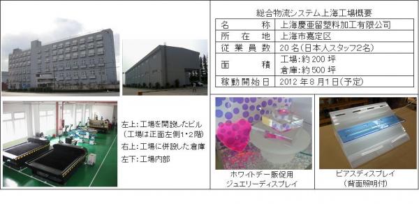 上海工場は、大阪・京都の国内2工場に続き3番目のアクリル樹脂加工工場で、海外では同社初の工場開設となります。当初は、日本人正社員2名と現地で採用した中国人スタッフ18名の計20名体制でスタートいたします。