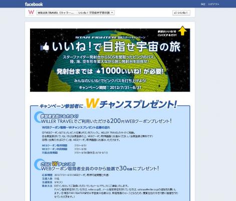 WILLER TRAVELの公式facebookページには、企業理念から商品開発の裏話まで紹介しており、今回のキャンペーン「いいね!で目指せ宇宙の旅」は8月から運行開始する体感型アトラクションバス『STAR FIGHTER』に見立てたバスをfacebook上で陸から宇宙へ発進させるために、ユーザーに「いいね!」で参加してもらい、その数によってバスが形態を進化させ、最終的には宇宙へ発進することができます。