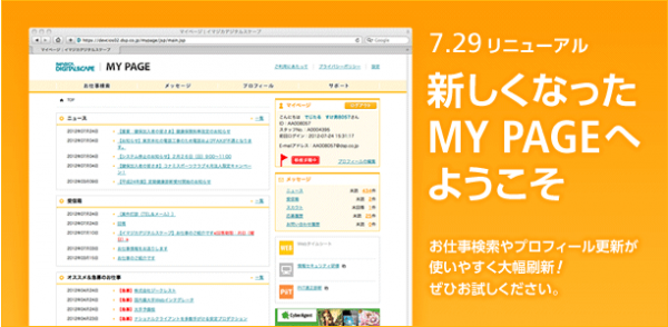 株式会社イマジカデジタルスケープ(本社:東京都渋谷区 代表取締役社長:大林 克己 URL: http://corp.dsp.co.jp/ 以下、当社)は、このたび当社の会員専用サイトである「マイページ」のリニューアルを行いました。