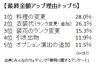 「最終金額がアップしている理由(複数回答)」のトップ5は「料理のランク変更(28.0%)」が最も多く、次いで「衣装代ランク変更・追加(26.1%)」「装花のランク変更(15.3%)」「引き出物(11.9%)」「オプション演出の追加(11.5%)」という結果になりました。