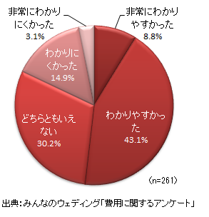 「契約前に結婚式場から出してもらった見積りについて、あてはまるものをお選びください」という設問に対し、回答は「非常にわかりやすかった(8.8%)」「わかりやすかった(43.1%)」と、51.9%がわかりやすかったと答えている一方、「どちらともいえない(30.2%)」「わかりにくかった(14.9%)」「非常にわかりにくかった(3.1%)」が、48.1%という結果になりました。