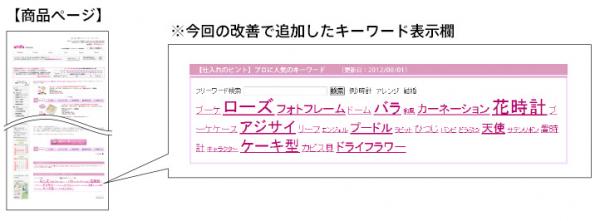 今回の改善では、プリザーブドフラワーを検索したユーザーの多くが同時に入力したサブキーワードを自社サイト内に組み込み、商品ページ内に表示するようにしました。これによりユーザーは他ユーザーが注目しているキーワードを、サイト内でも知ることが出来るようになりました。更にキーワードごとに対応ページへリンクさせることで、キーワード把握から商品ページ到達までを一貫して行え、市場が注目する商品を容易に知ることが出来るようになりました。今後もアミファは、あらゆるお客様のサイトのユーザビリティ(使いやすさ)の向上を目指して参ります。
