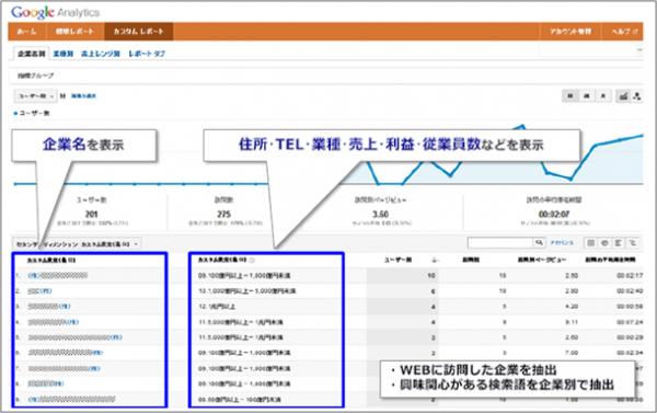 送られてくるIPアドレスデータに基づき、企業の属性情報を付与します。属性情報をお返しすることで、Googleアナリティクスなどのログ解析ツールで企業情報の抽出、分析が可能になります。