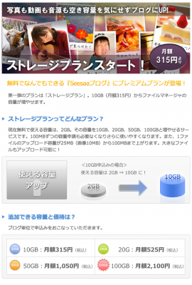 Seesaaブログは、無料でなんでもできるというのがサービスの特徴となっておりましたが、ユーザ様よりファイル容量を2GB以上使いたいというご要望を多数の頂いておりプレミアムプランの第一弾として「ストレージプラン」の提供を行う事になりました。