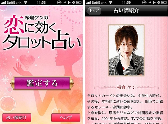株式会社インタースペース(本社:東京都新宿区、代表取締役社長:河端伸一郎、証券コード:2122)は、テレビ・雑誌等で活躍中のイケメン占い師 桜倉ケン監修の恋愛タロット占いアプリ『桜倉ケンの恋に効くタロット占い』を、App Storeにて2012年8月8日(水)より配信開始したことをお知らせ致します。(アドレス:http://itunes.apple.com/jp/app//id542123731?mt=8)