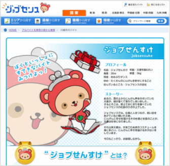 ジョブセンスは、張り紙感覚でWeb求人をコンセプトに、2006年4月よりサービスを開始した成功報酬型※1のアルバイト求人サイトで、2012年7月現在5万件を超える求人情報を掲載し、月間約300万人の求職者にご利用いただいております。当社では、「ジョブセンス」のサービスブランドについて一層認知度を高め、更なる利用促進を図るべく、当社初の試みとして公式キャラクターを起用することといたしました。