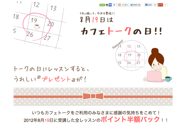 日本時間8月19日(GMT+09:00)に受講したオンラインレッスンの全てを対象に、受講費を半額ポイントバック!!