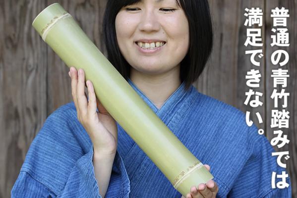 普通の青竹踏みより細い竹を材料に、また真半分に切るのではなく6:4の割合で