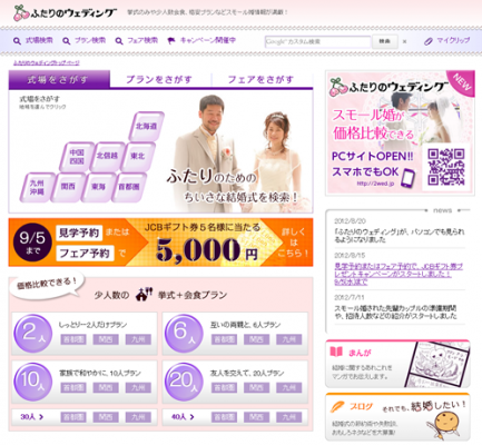 「ふたりのウェディング」は、上記のようなユーザーが求める挙式・会食のスタイルを「スモール婚」と定義し、「衣装付き挙式のみプラン」や「挙式後の少人数での会食」といったスモール婚情報を提供する新しいサービスです。当サイトは、旅行サイトのように、結婚式を「プラン」から探すことができる機能や、「何名でいくら」という金額情報を、わかりやすく比較できる検索機能も盛り込まれています。