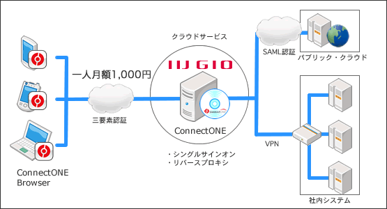 本サービスでは、従来オンプレミス型で販売されていたConnectONEサーバーを、IIJのクラウドサービスIIJ GIO(初期費用なし月額8,000円から)上で提供する。