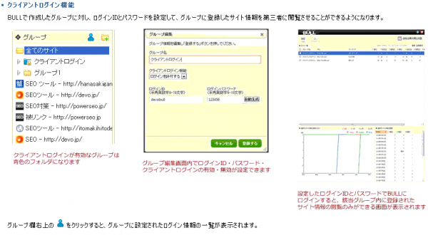 ・有料オプションのクライアントログイン機能を利用することで、BULLに登録したグループ毎に、ログインID・PASSを設定して、グループ内に登録したサイトの順位だけを顧客に参照させることが出来ます。