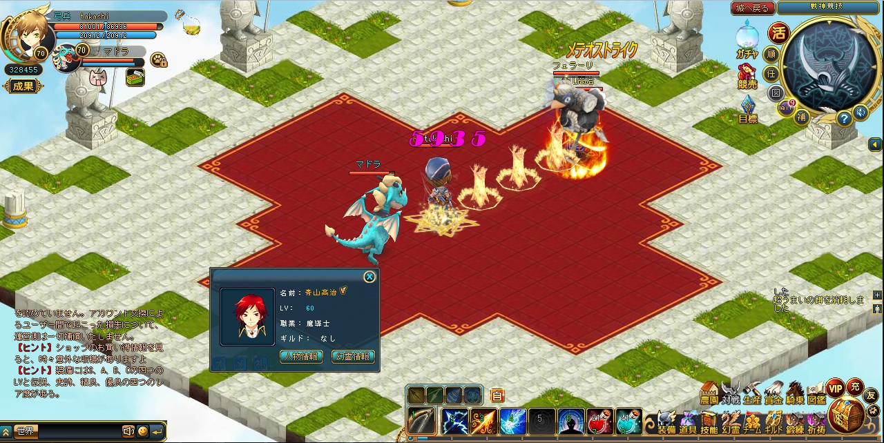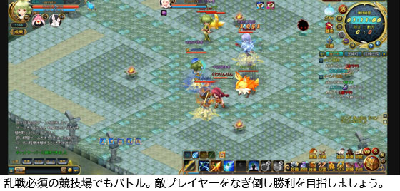 「競技場」ではLv25以上のプレイヤーが1vs1、3vs3、5vs5で同時間帯にロビーに入ったプレイヤーとランダムにチームを組んで対戦することができます。対戦部屋は、Lv10単位で分けられており、極端に実力差のある人との対戦は行われません。