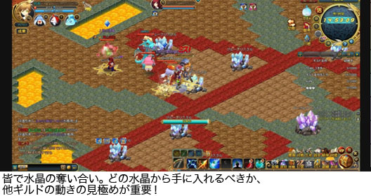 1チーム最大6名のギルドメンバーで協力しながら他のギルドの邪魔をしつつ、効率良く水晶を集める戦略バトルです。1位になれば、ゲーム内通貨である金貨を大量に獲得できます。
