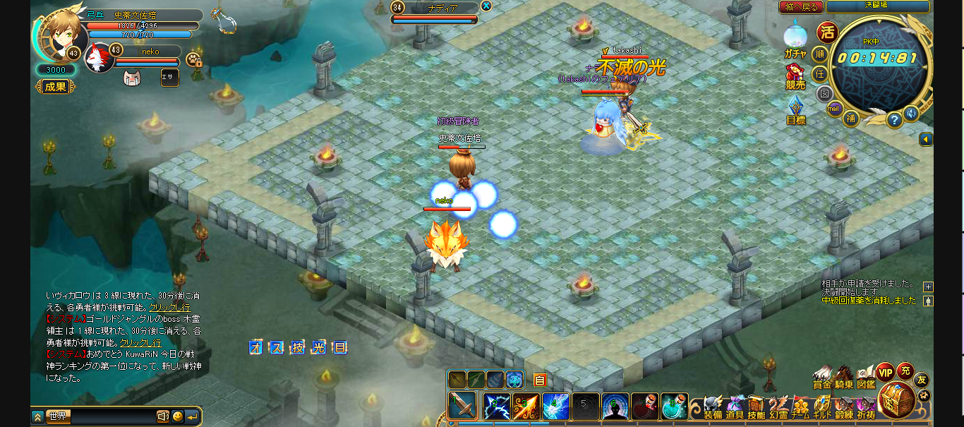 才色のフェアリアでは、同一サーバー内で見かけた他のプレイヤーに、いつでも1vs1の熱いバトル「決闘」を挑むことができます。「いつ何時誰の挑戦を受ける!」も良し、「時には来たれり!」とばかり誰彼かまわず挑戦しまくるのも良し。もちろん挑戦を挑まれても拒否しつづけるヘタレプレイも可能です。