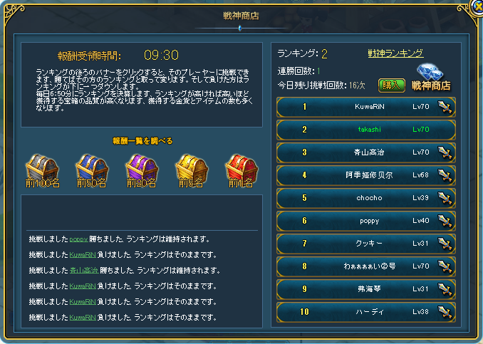 戦神ポイントを貯めてランキングTOP10に入る事で特殊アイテムを手にいれたり、戦神ポイントを貯める時に得られる「戦神の紋章ポイント」を戦神商店で消費する事で、特別なアイテムと交換する事も出来ます。