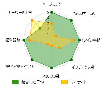 -ページランク、Yahoo!カテゴリ登録有無、ドメイン年齢、インデックス数、被リンク数、被リンクドメイン数、総単語数、キーワード比率について、自社サイトと競合上位10件の状況をレーダーチャートで表示