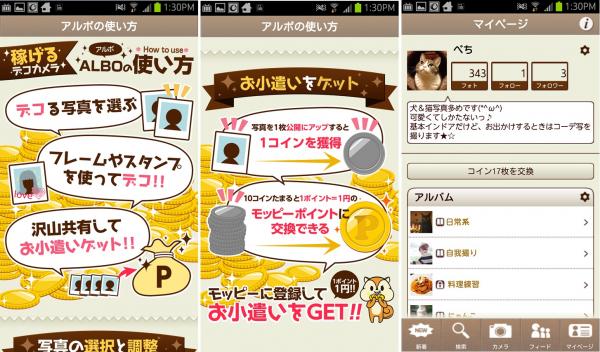 「ALBO」では、アプリ上からデコ写真を投稿するとアプリ内にコインが貯まります。写真1枚に付き1コインが付与されます。貯まったコインは、セレスが運営する国内最大級のモバイルポイントサイト「モッピー」を通じて、現金や電子マネー(楽天Edyやウェブマネーなど)、JALマイレージバンクなどへ交換することができます。写真をデコって、友人とコミュニケーションして、お金が稼げるカメラアプリです。
