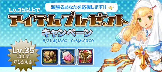 レベル上げを頑張っているプレイヤーに向けて、キャンペーンを実施いたします。キャンペーン期間内にレベル35以上になったプレイヤー全員に豪華アイテムをプレゼントいたします。