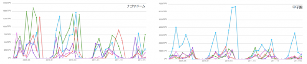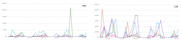 ※下記グラフ画像参照 それぞれの赤、緑、青、紫、桃は順に11年の上位順。(中、ヤ、読、阪、広、横)